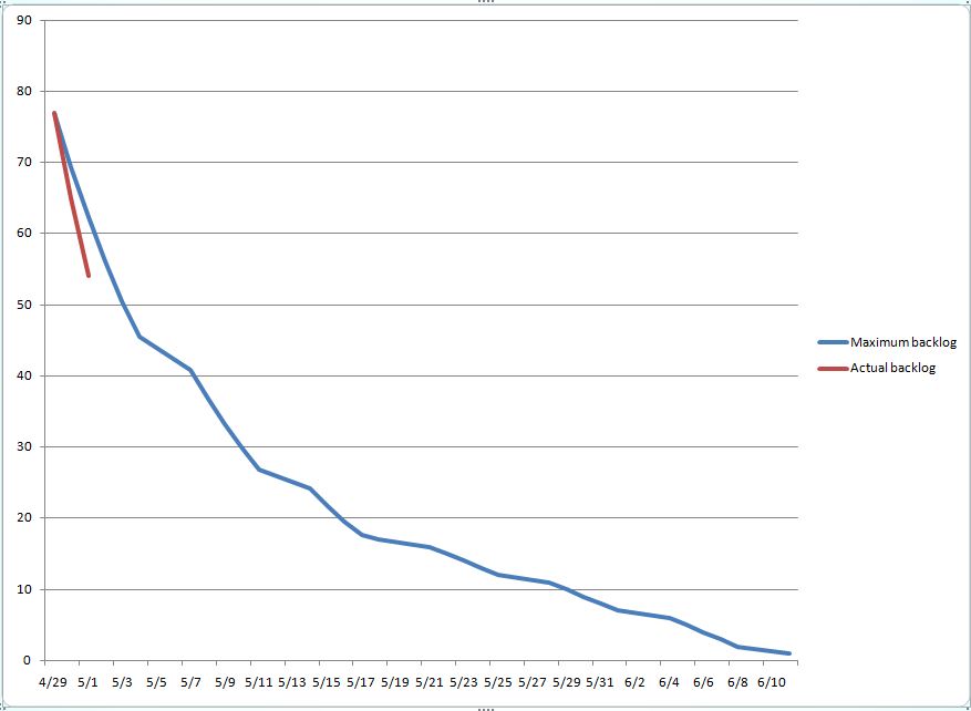 I adjusted my spreadsheet to account to not working on weekends. That’s why the chart has little zig-zags. Progress will slow down on weekends.