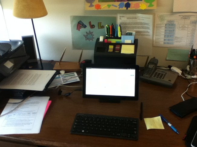 Here is the slate on my desk, with docking station, Bluetooth keyboard, my old HP printer, and the answers to my students’ case this week.